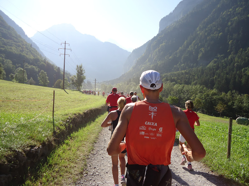 Am Ende der Schlaufe durchs Lauterbrunnental decken wir uns in Ey erneut mit Wasser ein, denn ein paar hundert Meter weiter folgt die berüchtigte Rechtskurve, die zur "Wengener Wand" hoch führt. Abgesehen von der Eigergletscher-Moräne folgen jetzt die steilsten Kilometer. Wir wechseln, wie die meisten Läufer um uns herum in einen strammen Bergwander-Schritt.