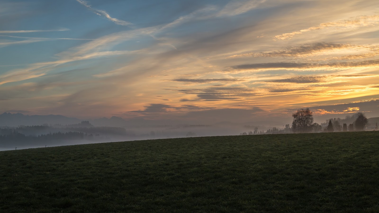 Wir haben keine Ahnung, wie weit der Heimweg sein wird, und stellenweise deckt dichter Nebel die unbekannte Landschaft zu. Erst als ein Wegweiser auf eine vertraute Ortschaft hinweist, können wir die mystische Sonnenuntergangs-Stimmung richtig wertschätzen und in Ruhe bestaunen.